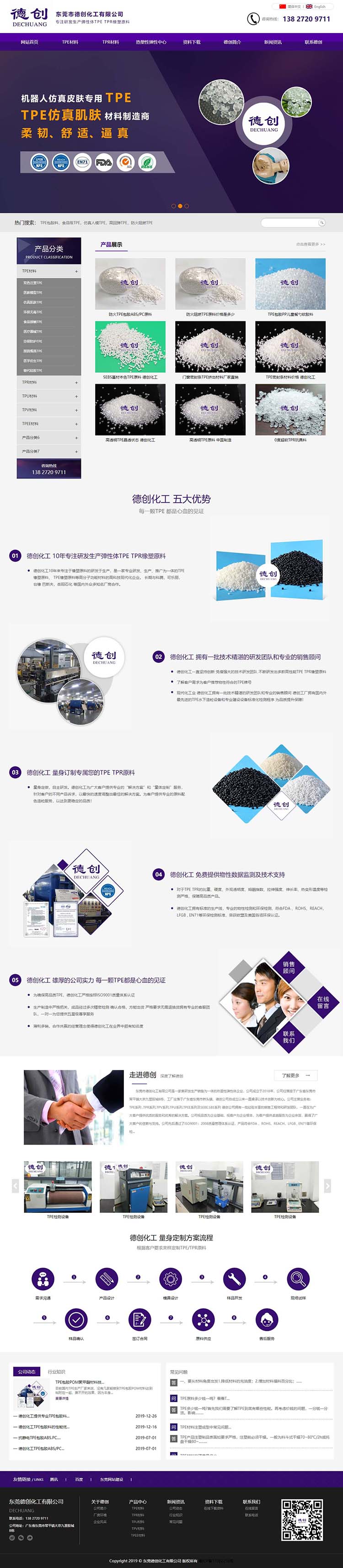 東莞市德創化工有限公司是一家集研發生產銷售為一體的熱塑性彈性體企業,公司成立于2018年,公司位落座于廣東省東莞市常平鎮大京九塑膠城B棟,工廠坐落于廣東省東莞市橋頭鎮,德創公司自成立以來一直秉承以技術創新為核心。公司主營業務有:TPE系列 .TPR系列.TPV系列.TPU系列.TPEE系列及SEBE.SBS系列 德創公司擁有一批經驗豐富的銷售工程師和研發團隊,一直在為廣大客戶提供優質的服務和優秀的解決方案。公司視品質為企業基礎,視客戶為企業根本,為客戶提供卓越服務為企業宗旨,贏得了廣大客戶的信賴與支持。公司先后通過了ISO9001:2008質量管理體系認證,產品符合FDA 、ROHS、REACH,LFGB , EN71等環保檢測標準。德創公司真誠期待著與您建立良好的合作關系,以我們專業的技術和優質的服務為您搭建成功橋梁,讓我們一起攜手共進,德創公司一定會成為您滿意的材料供應商!